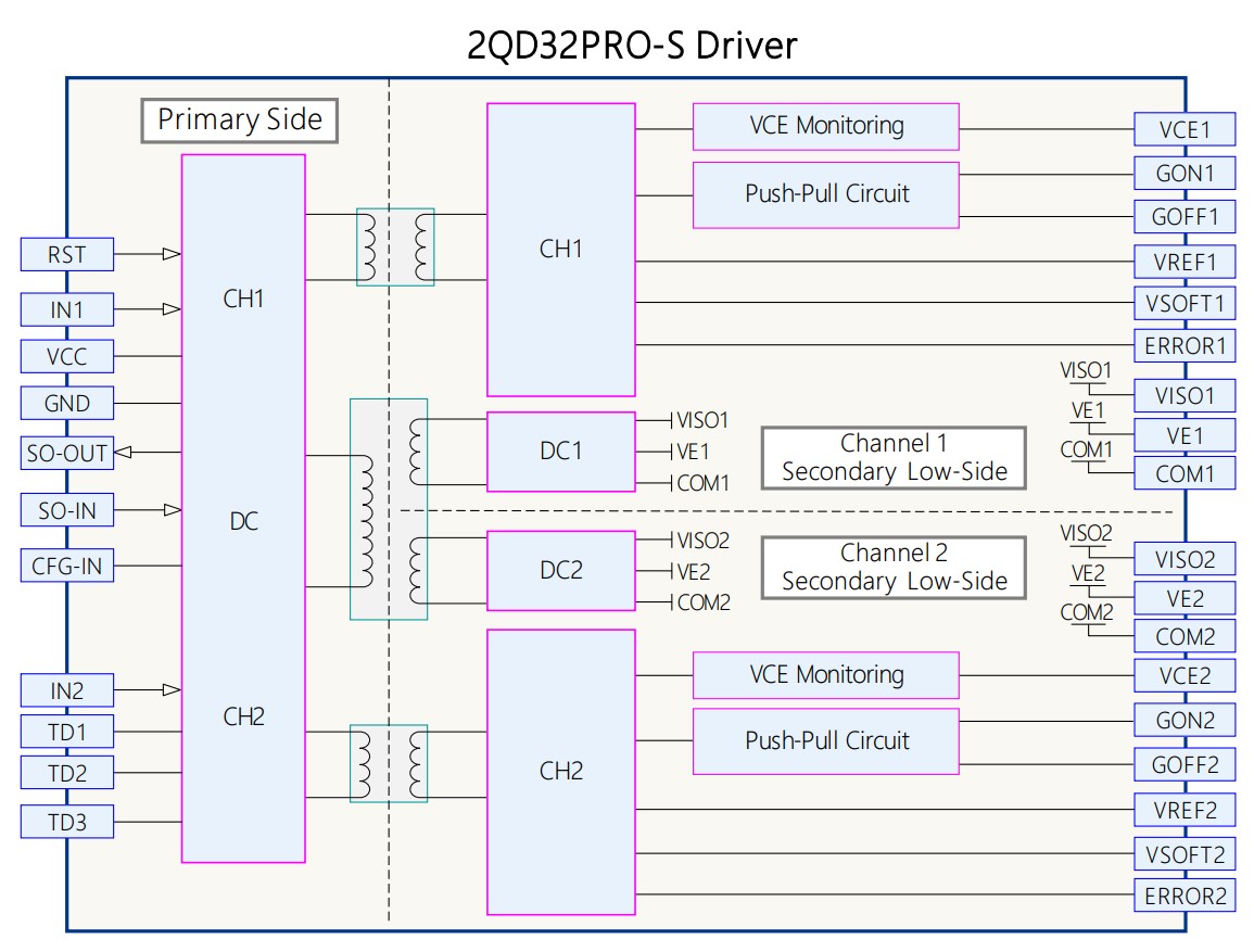 2QD32PRO-S is a medium- and high-power, high-reliability, dual-channel driver designed specially for SEMIKRON SKYPER 32PRO. It is fully compatible with SEMIKRON SKYPER 32PRO, and serves directly as a substitute without any effort in adjusting or redesign the driver for a specific application.