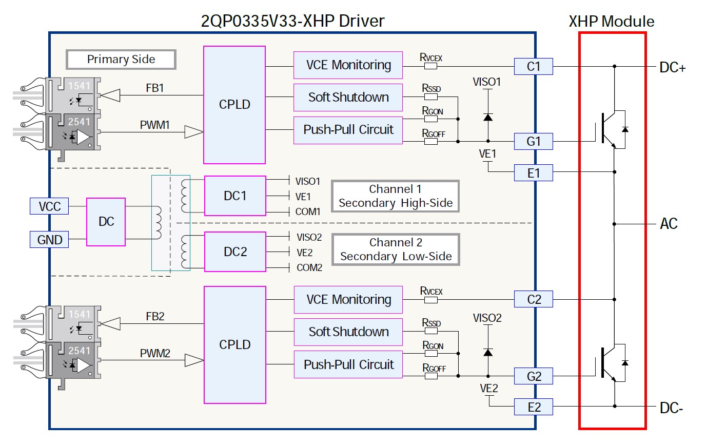 2QP0335V33-XHP is a compact dual-channel high-insulation driver for IGBT modules, designed for high-reliability high-power medium-voltage applications.