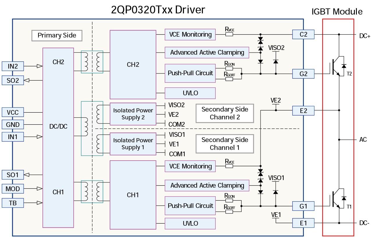 2QP0320Txx is a medium power, dual-channel Plug-and-Play gate driver designed for high reliability applications based on the ASIC chipset developed by Bronze Technologies.