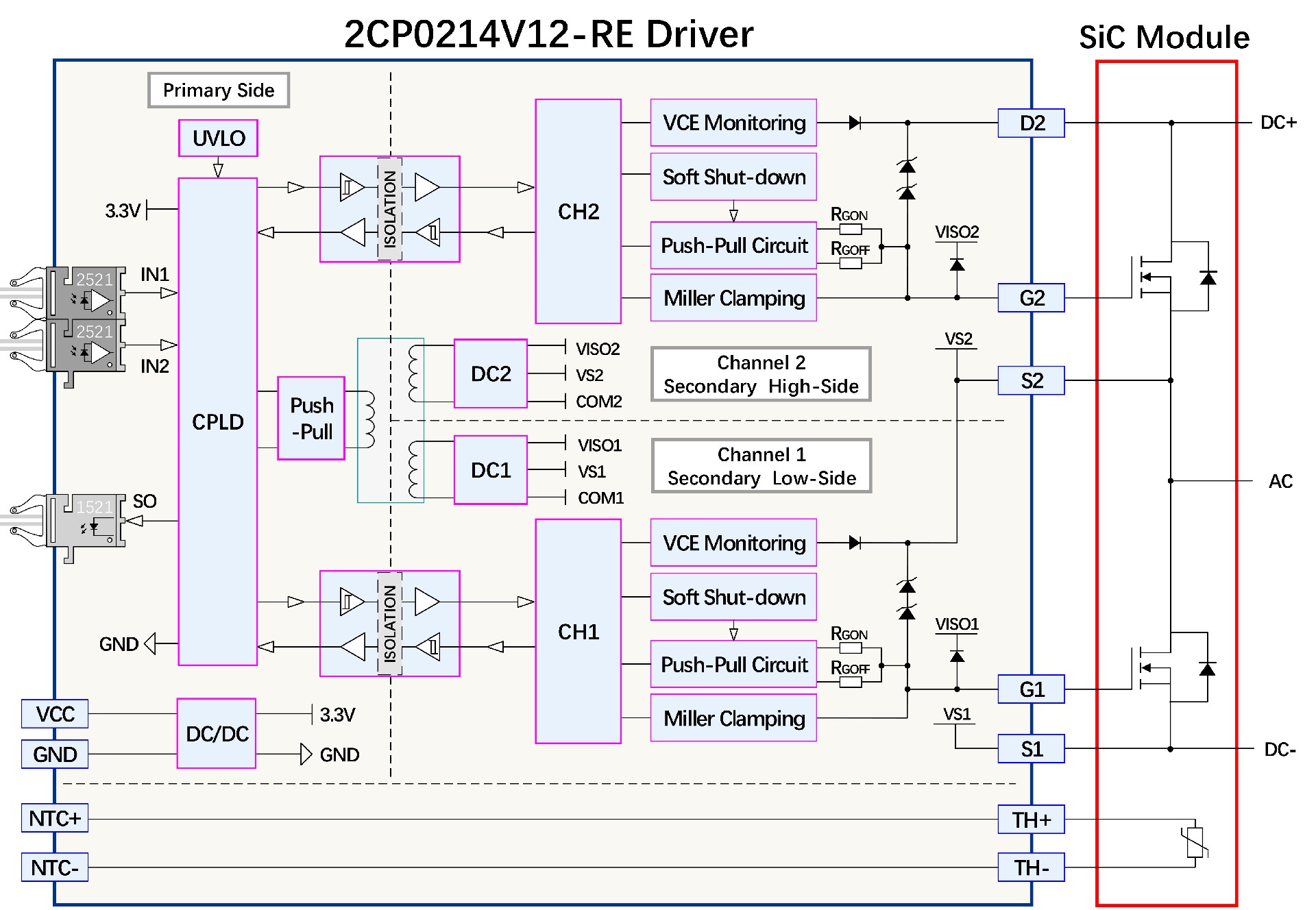 2CP0214V12-RE is ideal for multiple topologies constructed with ≤1200V SiC modules. The plug-and-play function allows direct soldering of the driver board on the IGBT module, eliminating the necessity for an adapter. It supports input and output of optical logic signals.