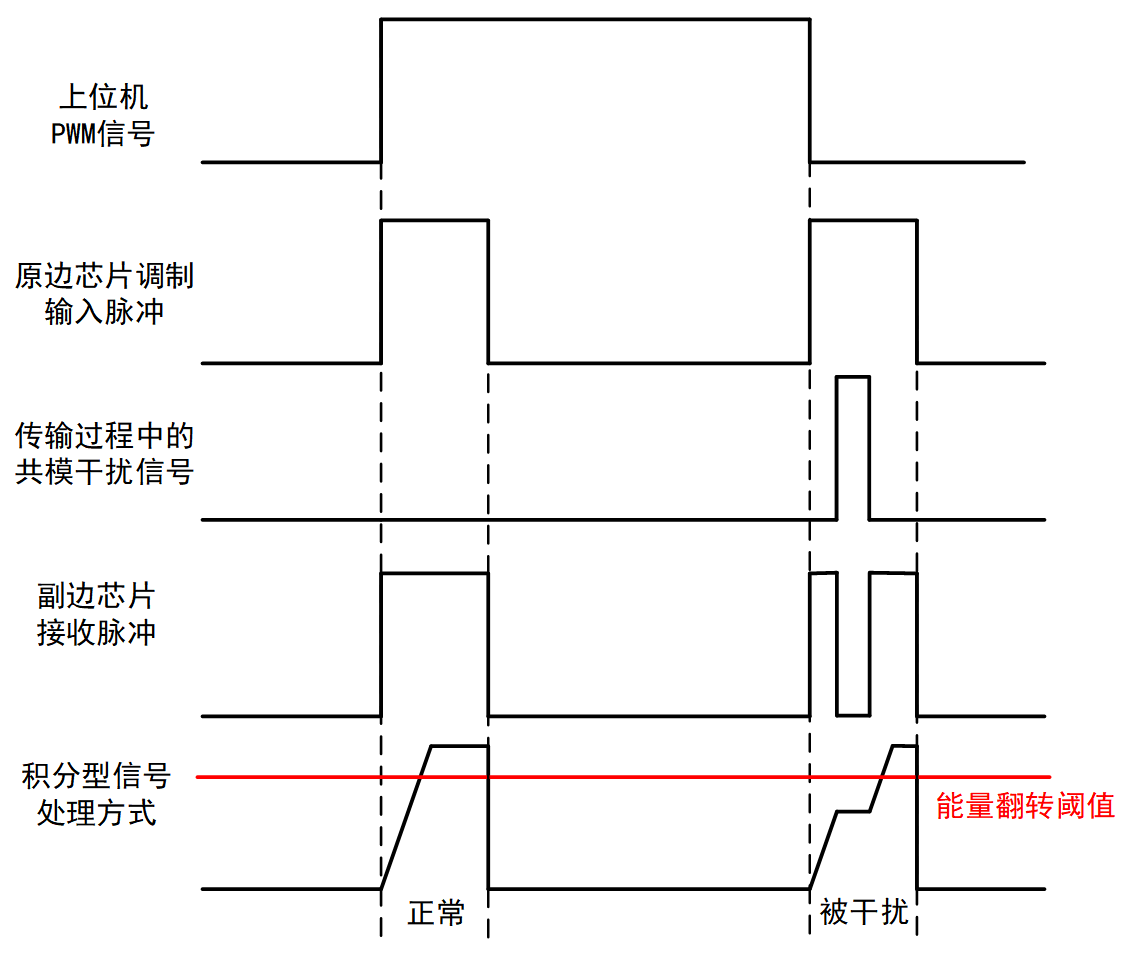 · 原理揭秘:接收電路會對信號進行“能量積分”。如下圖所示,原邊芯片將上位機輸入的PWM信號進行調制,變成脈沖信號穿過脈沖變壓器,副邊芯片接收脈沖信號進行解碼積分。當積分值超過設定的識別閾值時,副邊芯片將執行驅動器的門極動作。