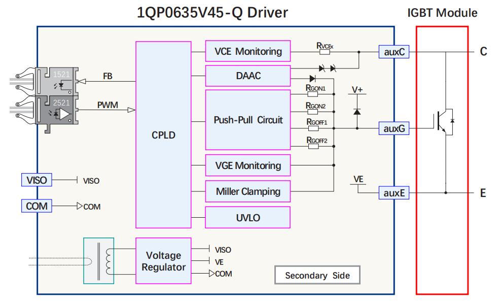 1QP0635V45-Q驅(qū)動器采用數(shù)字控制芯片CPLD和光纖信號傳輸接口,數(shù)字化控制優(yōu)化了IGBT開關(guān)性能,同時為IGBT提供最優(yōu)化的保護(hù)。驅(qū)動器具有良好的EMC特性,適用于惡劣的電磁場環(huán)境。